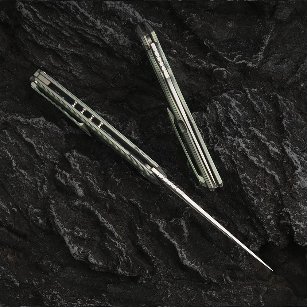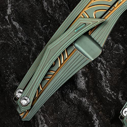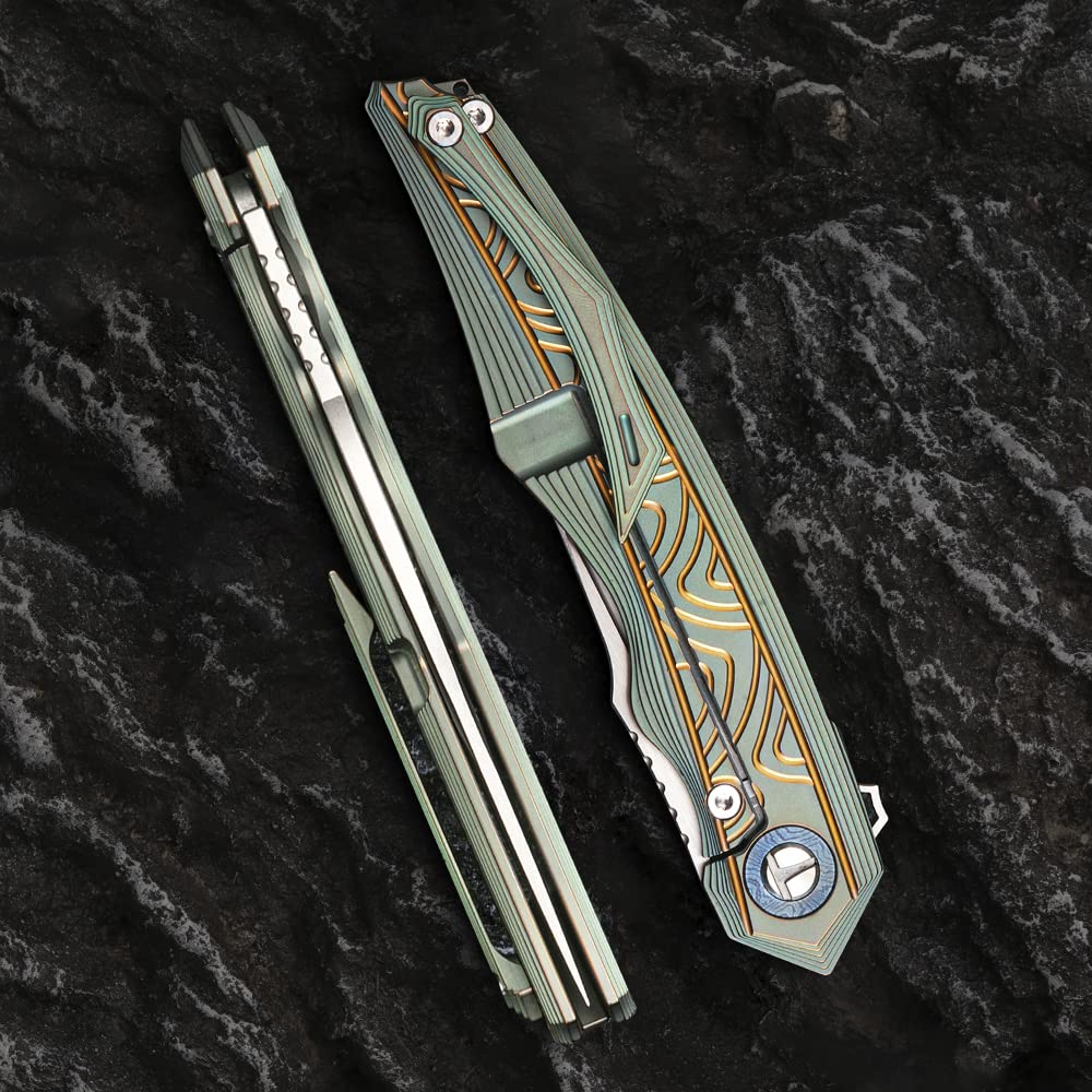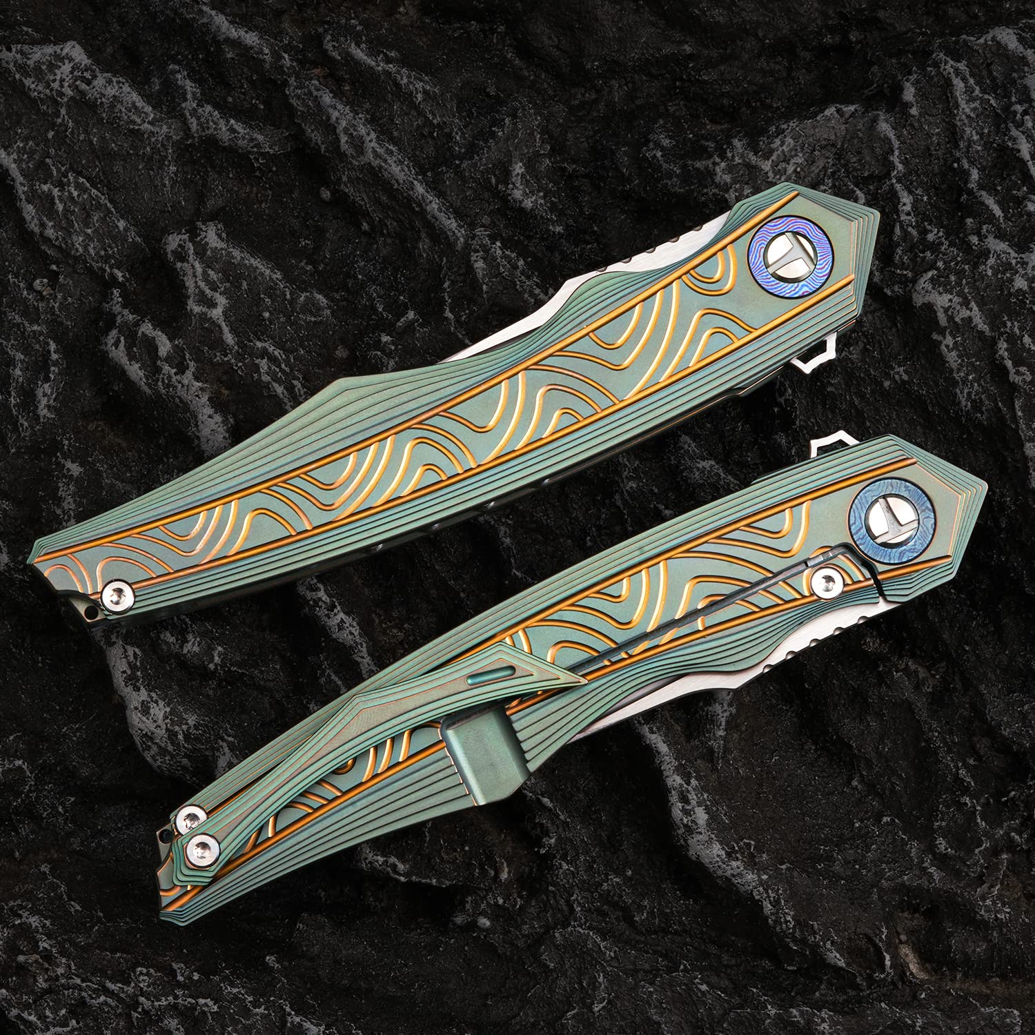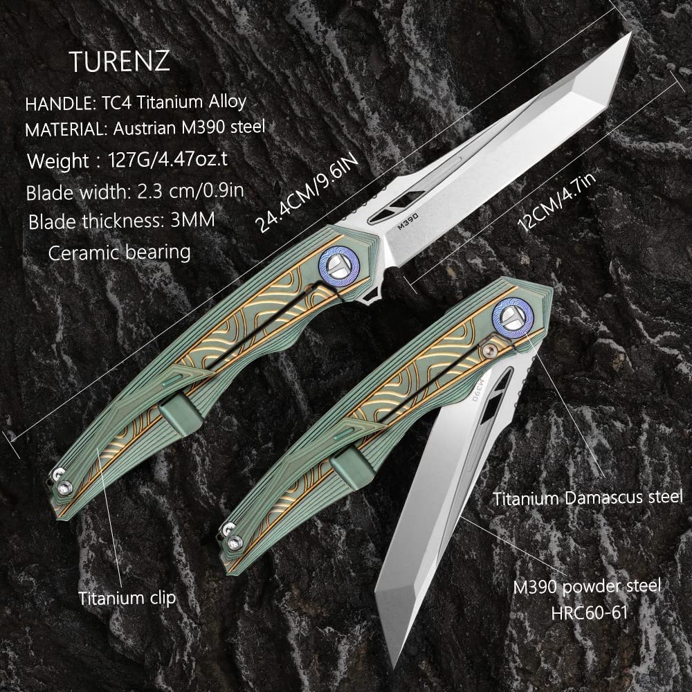 Expertly hand-crafted TC4 titanium folding knife, featuring M390 powder steel blade with retro effect and secure locking mechanism. Versatile for outdoor activities or everyday use, including emergency situations.