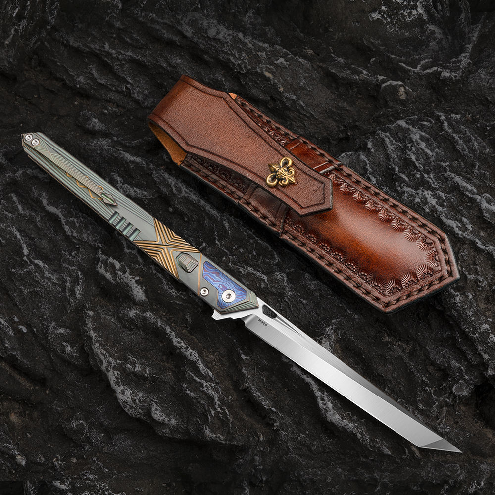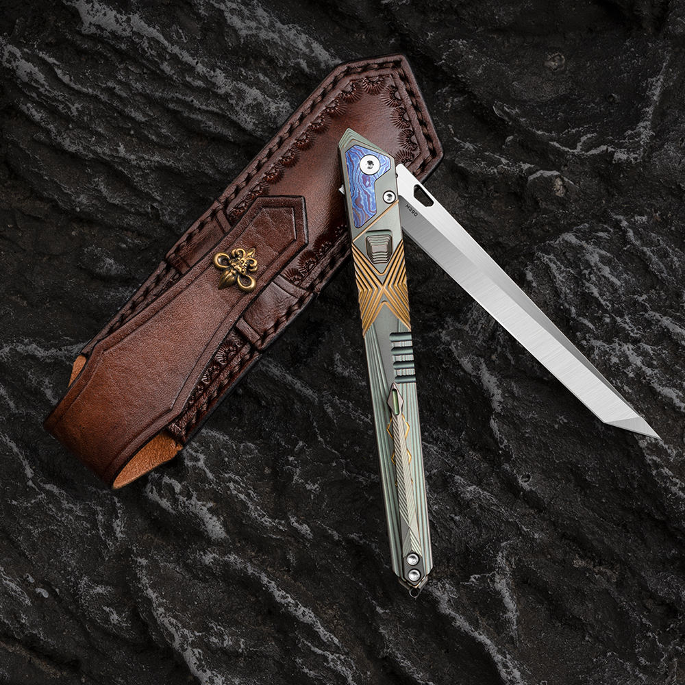 The M390 steel outdoor folding pocket knife with simple line design, with strong sharpness and practicality, very suitable for outdoor camping, fishing use, easy to carry, tC4 titanium alloy lining locking mechanism was adopted. Easy to carry and safe to carry pocket clip, emergency use of glass crusher, high hardness, high wear-resistant, high-quality steel M390, with hand-made leather cover, suitable for outdoor EDC tools